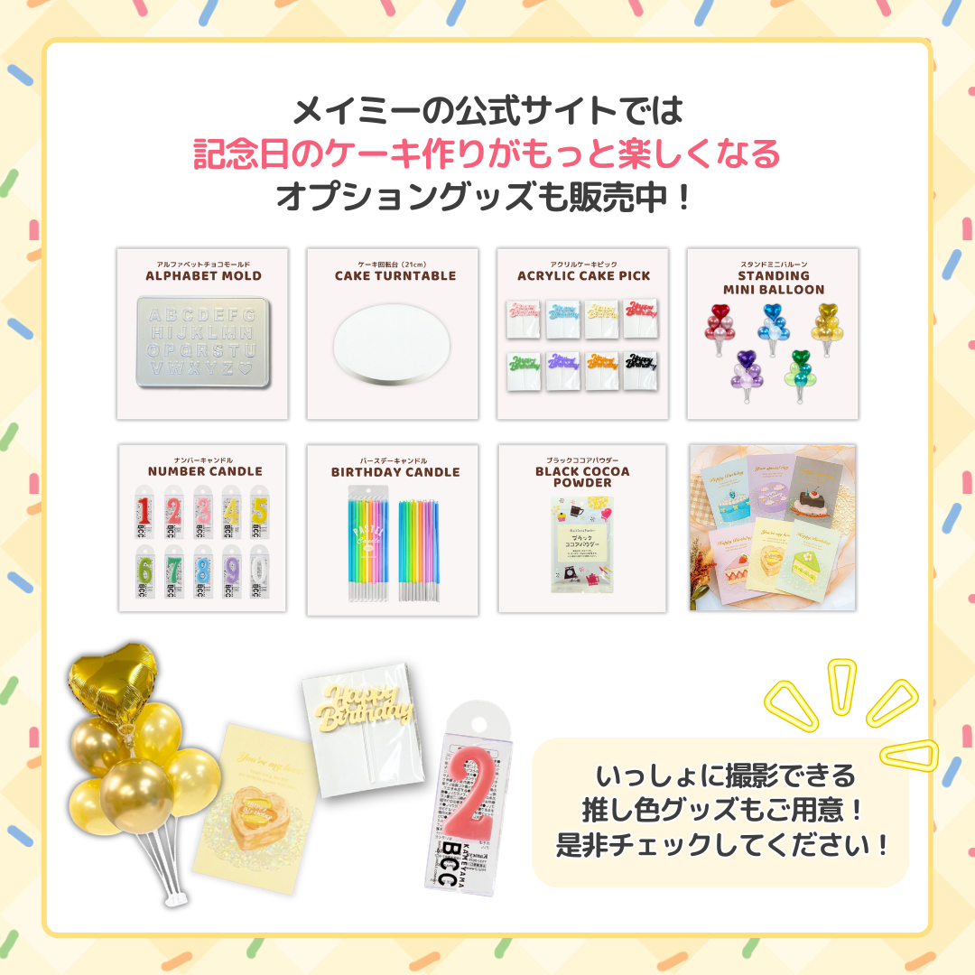 - CAKE KIT:ケーキミックス粉、ホイップミックス粉、アラザン、12cmケーキ型(紙製)、ケーキヘラ、絞り袋(口金付き)、オーブンシート、レシピ